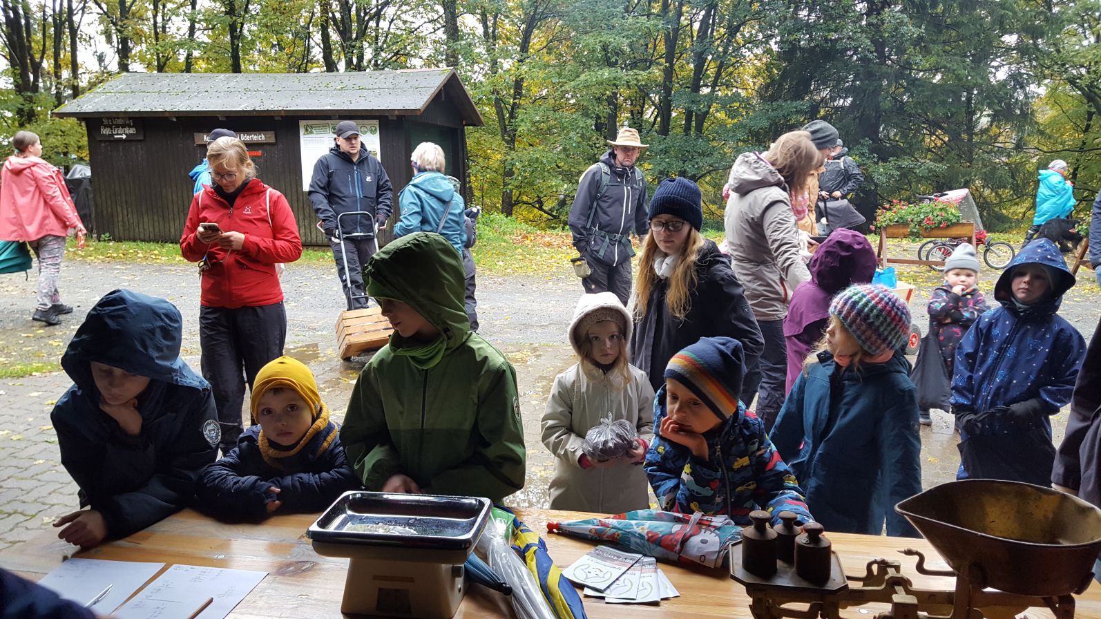 Die im voraus gesammelten Baumfrüchte werden vor Ort gewogen und jedes Kind bekommt Süßigkeiten im Tausch. Die drei größten Sammlungen werden mit tollen Preisen honoriert.