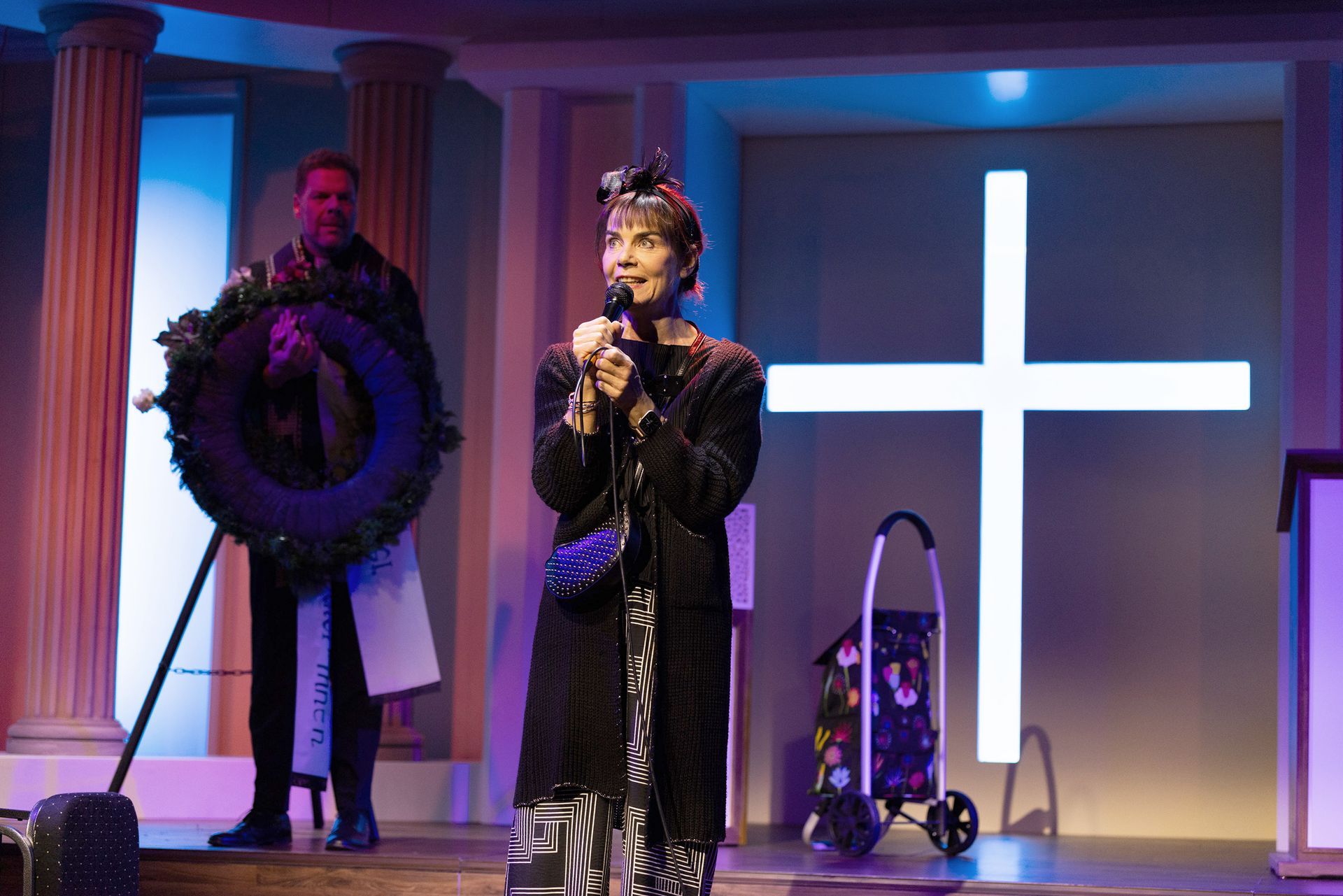 Der Tod ist nie schön. Aber es könnte schlimmer kommen, als mit 94 Jahren friedlich einzuschlafen: Zum Beispiel eine Trauerfeier, die völlig aus dem Ruder gerät. Gernot Steinfels, Patriarch einer mittelständischen Firma, ist verstorben, und sein designierter Nachfolger (60) richtet für das Unternehmen die Beisetzung aus. Doch sein Text auf der Schleife sorgt für heftige Irritation: „In tiefer Trauer. Deine Mitarbeiter“. Was ist denn mit den Mitarbeiterinnen? Schnell hat der neue „alte weiße Mann“ an der Spitze nicht nur seine Marketing-Leiterin, den Social-Media-Chef und seine Sekretärin gegen sich, sondern auch die sehr selbstbewusste Praktikantin. Vor dem Theaterpublikum als versammelter Trauergemeinde zerfleischt sich in diesem hochpointierten Stück schließlich die Führungsetage der Firma immer mehr. Und nicht einmal der verzweifelte Pfarrer kann die Wogen glätten.