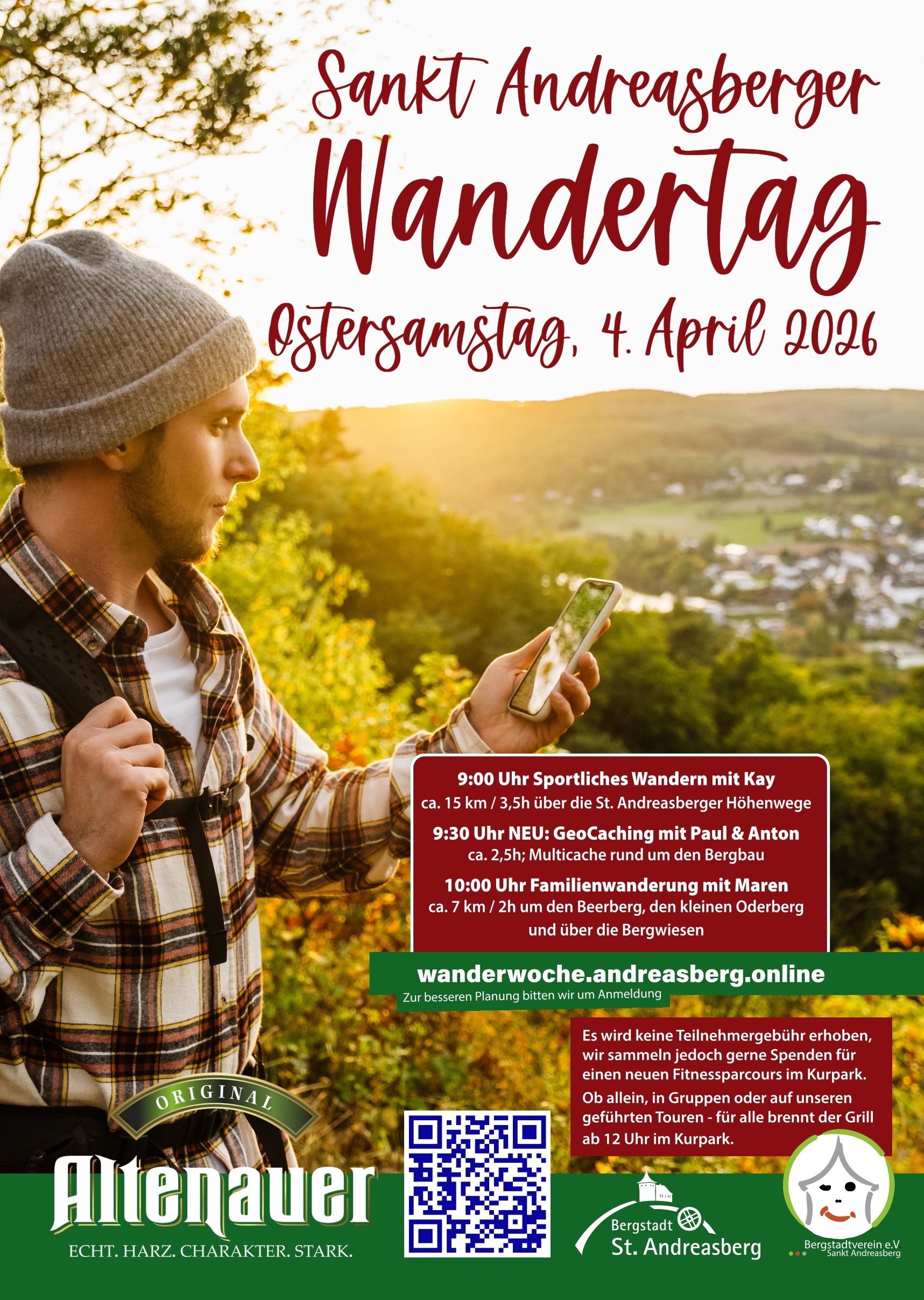 Die Sankt Andreasberger Wanderwoche ist eine regelmäßig stattfindende Veranstaltung, die verschiedene geführte Wanderungen für unterschiedliche Niveaus anbietet, von leichten Familienwanderungen bis zu anspruchsvollen Touren für Geübte. Die Organisation erfolgt durch den Bergstadtverein und bietet kostenlose Teilnahme mit der Bitte um Spenden zur Schaffung eines Fitnessparcour im Kurpark von Sankt Andreasberg.